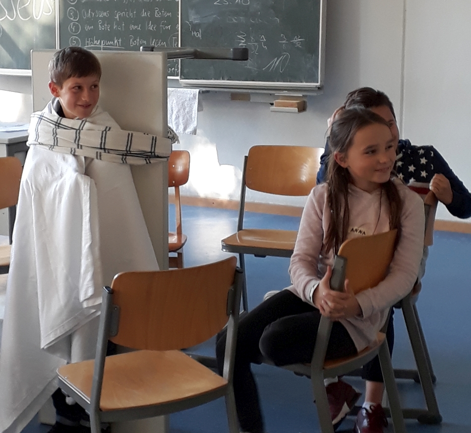Während die Schüler in Geschichte die historische Quellenlage mit kritischem Blick prüfen und beim Verfassen eines Zeitungsartikels erste Erfahrungen mit journalistischem Arbeiten machen, wird im Fach Deutsch bei der szenischen Umsetzung einzelner Episoden der Odyssee Identifikation mit den einzelnen Personen möglich. Interviews, Flaschenpost und Briefe sind die Ergebnisse produktiver Schreibaufgaben. Die selbstständige Erarbeitung einer Gedankenlandkarte zum Thema steht im Bereich Wort und Bild auf dem Programm. Schülerinnen und Schüler lernen verschiedene Möglichkeiten der Visualisierung am Beispiel von Comicbildern, Hörspielen oder Zeichentrickfilmen kennen. Ebenso kreativ setzen sie sich im Fach Bildende Kunst oder in Musik mit markanten Episoden aus der Odyssee auseinander. Mit Hilfe von mitgebrachten Requisiten, Mimik und körperlicher Ausdrucksfähigkeit werden mit sichtlich viel Spaß und tollen Ideen zum Beispiel eine rudernde Schiffsmannschaft, der Kampf mit dem Zyklopen oder der Bogenkampf dargestellt. Mit Orffschen Instrumenten werden Szenen musikalisch illustriert und die jeweilige Stimmung verstärkt, aber auch Gefühle wiedergegeben. So wird die dumpf-schaurige Atmosphäre des Schattenreichs oder die Bedrohung durch die verführerisch lockenden Sirenen eindrucksvoll gestaltet. Bei der Präsentation vor gespanntem Publikum treten schließlich auch musikalisch geübtere Schülerinnen und Schüler als „Seefahrer-Orchester“ auf, wodurch die Vorführung für Darsteller und Zuschauer zu einem eindrucksvollen Erlebnis wird.