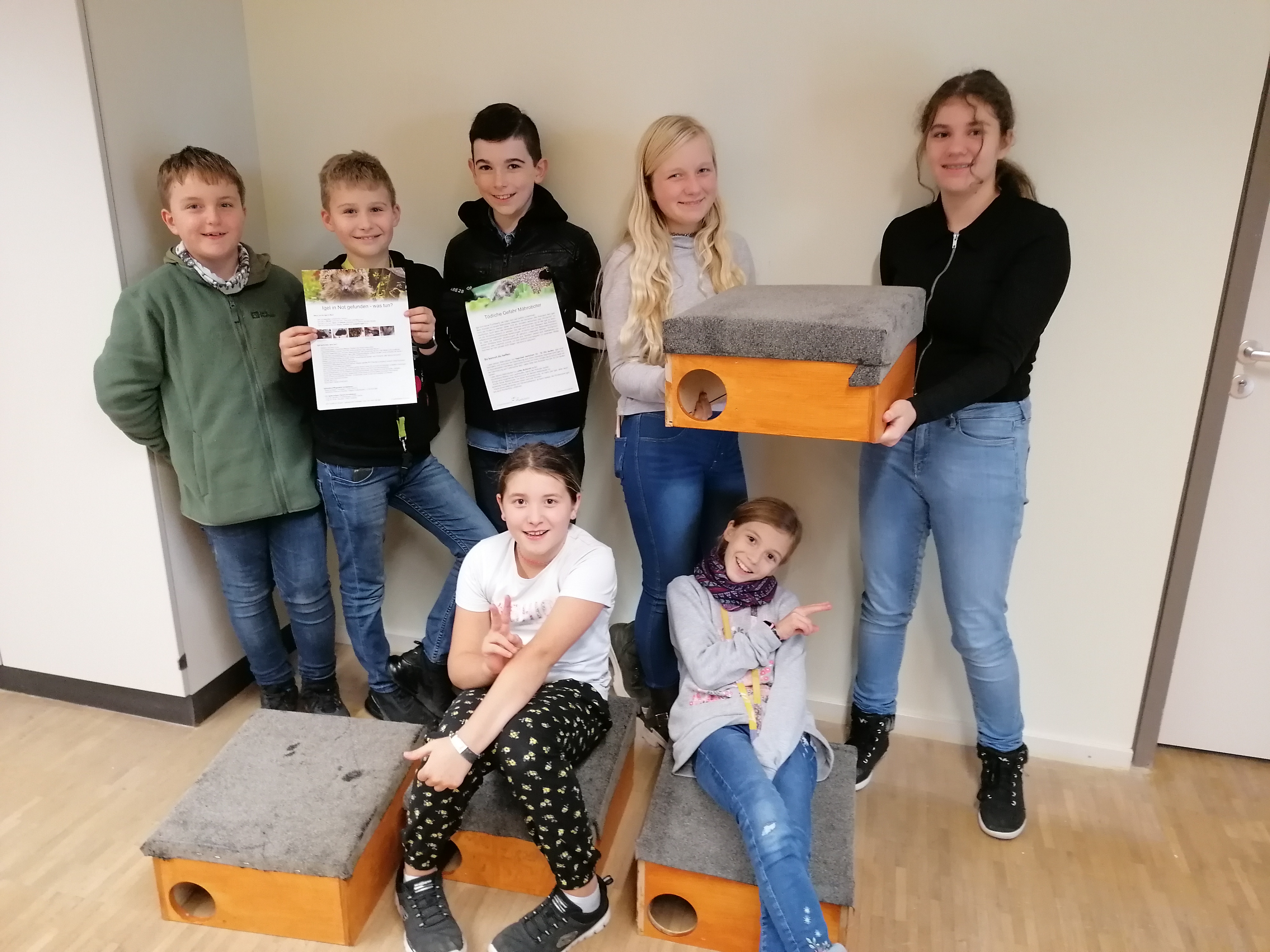 Aus diesem Grund baut die Naturschutz-AG der Heimschule einmal im Jahr Igelhäuser, die anschließend in Gärten und auf dem Schulgelände aufgestellt oder gar an Igelauffangstationen gespendet werden. Das Holz für die Igelhäuser stammt dieses Jahr aus defekten Schülerboxen, die auseinandergebaut und zugesägt wurden. „Upcycling“ nennt man das heutzutage, was so viel bedeutet, wie dass aus „Müll“ etwas Sinnvolles, Neues entsteht. In diesem Fall ein sicheres Winterquartier für unsere stacheligen Gartenbewohner.