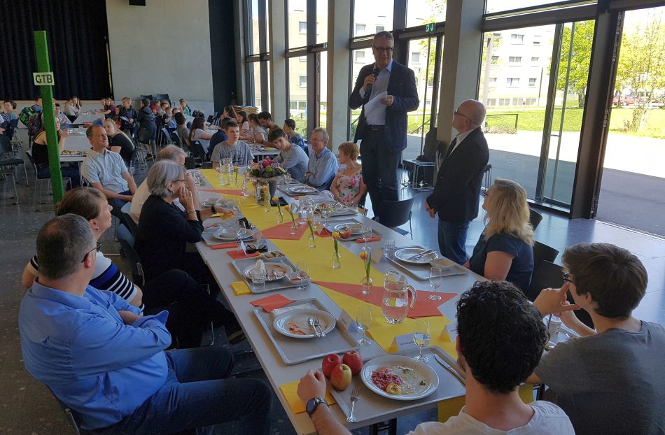 Diese Möglichkeit nutzte Mussler, um sich auch selbst von allen Mitgliedern der Schulgemeinschaft zu verabschieden. Wie stark er diese als Ganzes im Blick hat, zeigt, dass er ausdrücklich darum bat, den Betrag für ein Abschiedsgeschenk dem Sozialfond der Schule zugute kommen zu lassen. So bedanken wir uns auch an dieser Stelle bei Reinhard Mussler für seinen Einsatz für das tägliche Wohl an unserer Schule und wünschen für den Ruhestand alles Gute und „Bon Appetit“ für die freie Zeit!