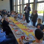 Die Schul- und Internatsleitung, Mitarbeiter aus der Verwaltung, Mitarbeitervertreter, Elternvertreter, Schülervertreter und die Internatssprecher: Alle waren gekommen und dies sicher gerne, denn sie wurden aus der Mensaküche der Heimschule verköstigt. Während der Mittagspause, d.h. während auch hunderte Schülerinnen und Schüler ihr Mittagessen einnahmen, konnten sich alle wieder einmal davon überzeugen, auf welch bemerkenswerten Standard Reinhard Mussler als Küchenchef die Mensaküche entwickelt hat. Dass an der Heimschule täglich frisch gekocht wird und dies abwechslungsreich, gesund und lecker, ist weithin bekannt und trägt wesentlich zum guten Ruf der Schule bei. Gesamtleiter Eberhard Pfister dankte Mussler daher für sein „äußerst verlässliches und kreatives Engagement.“