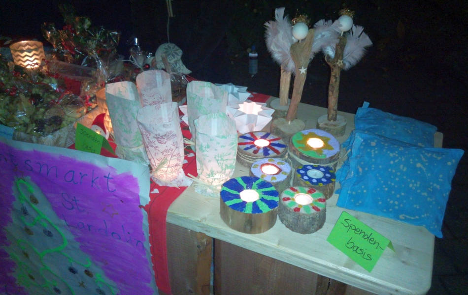 Der Kreativität waren keine Grenzen gesetzt, so gab es Schneemänner (aus weißen Lebkuchen zusammengesetzt), Knusperschokolade, Engelsaugen und bunte Plätzchenmischungen. Alles hatten die Schülerinnen und Schüler sehr liebevoll weihnachtlich verpackt. Außerdem bot die Klasse Engel aus Naturmaterialien, selbst genähte Kissen und verzierte Wind- und Teelichter an.