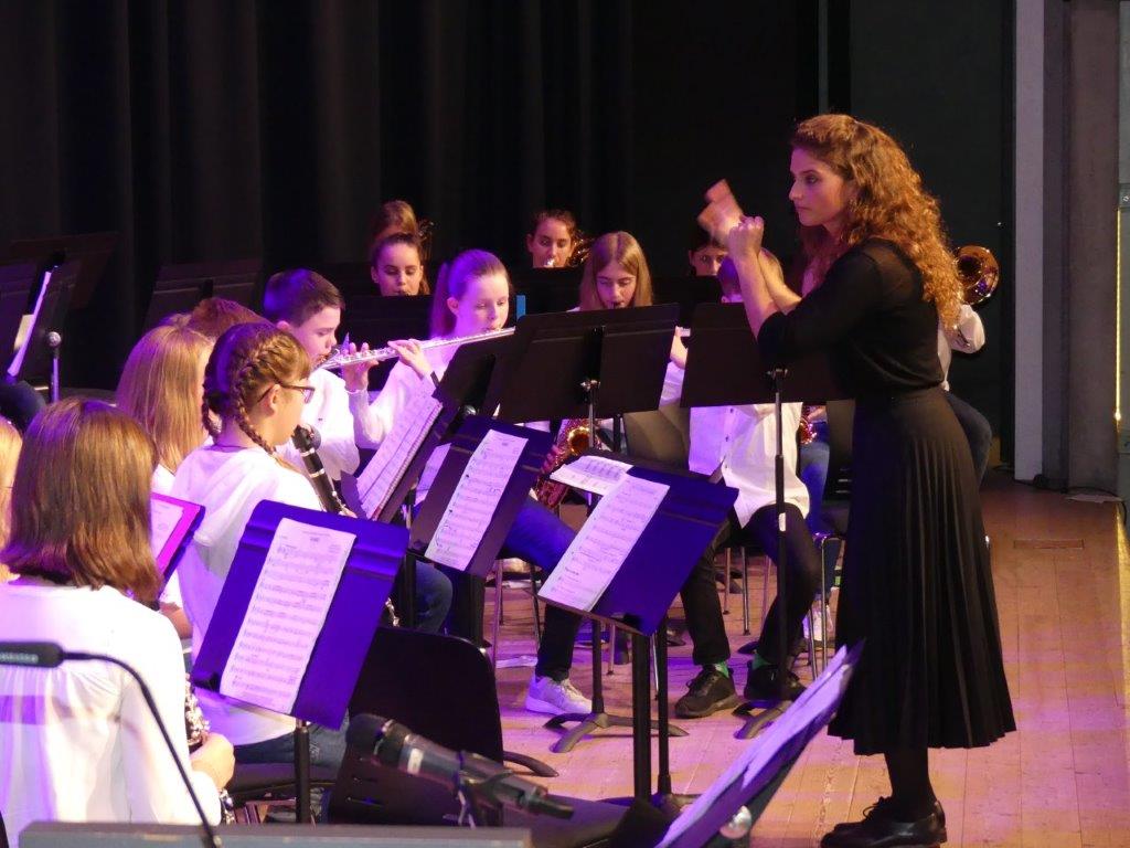 Die Schulleiterin der Realschule, Frau Nicola Heckner, versprach in ihrer Begrüßung einen musikalischen Genuss und blasmusikalische Leistungen, die die Eltern stolz auf die Bläser machen würden – beide Versprechungen wurden in hohem Maß erfüllt. Sie begrüßte persönlich Frau Dee Boyd, die Dirigentin des Jugendblasorchesters Breisgau, die mit jeder Bläserklasse einige Tage geprobt hatte und die Musikstücke zur Aufführung brachte. Seit der Gründung der Bläserklassen im Jahr 2005 ist es schon Tradition, dass die Musiker zur Erweiterung des musikalischen Horizonts von Gastdirigenten dirigiert werden.