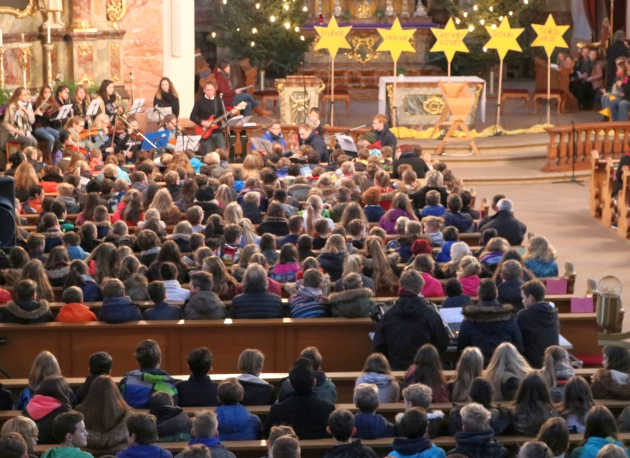Fünf große Sterne mit den Begriffen Freiheit, Heimat, Gemeinschaft, Schule und Solidarität standen im Zentrum der Weihnachtsgottesdienste für die Klassen 5 bis 10, die am letzten Schultag vor Weihnachten in der Ettenheimer Stadtkirche gefeiert wurden. Diese Worte können wahre Sternstunden ausdrücken, wenn sie mit positiven Erlebnissen in Verbindung gebracht werden. So kann ein Klassenerlebnis Gemeinschaft erfahrbar oder etwa das Besteigen eines hohen Berges die Ahnung von Freiheit spürbar machen.
