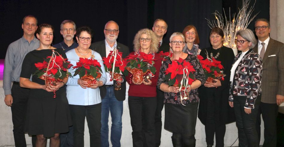 Ebenfalls wurden im Rahmen der Weihnachtsfeier zahlreiche Ehrungen für langjähriges Wirken an unserer Schule ausgesprochen. Zehn Lehrerinnen und Lehrer wurden von der Schulleitung und der Mitarbeitervertretung mit persönlichen Dankreden und Präsenten bedacht. MAV-Vorsitzender Philipp Drechsler würdigte die Kolleginnen und Kollegen, indem er sie mit passenden Musikstücken charakterisierte und ihnen dafür dankte, dass all diese Kollegen „verlässliche Grundtöne in unserem großen Ensemble sind.“ Zudem wurde Reinigungskraft Nadja Stöhr mit einem herzlichen Dank der Schulleitung und kräftigen Applaus aller Kolleginnen und Kollegen in den Ruhestand verabschiedet.