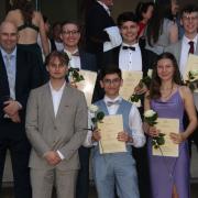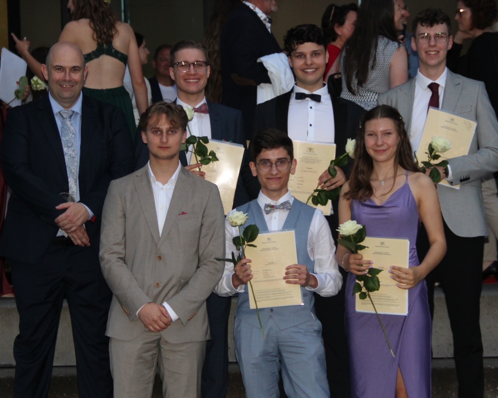 Die Abiturprüfungen sind beendet und am ersten Juliwochenende konnten 83 Schülerinnen und Schüler am Allgemeinbildenden Gymnasium und 57 Schülerinnen und Schüler am Beruflichen Gymnasium ihre Abiturzeugnisse entgegennehmen. Herausragend waren sechs Schülerinnen und Schüler, die das Abitur mit 1,0 bestanden: Noah Disch, Cidrik Kupfer, Sophia Metzger und Henrik Seitz sowie Felix Streit und Bastien Binder (siehe Foto).