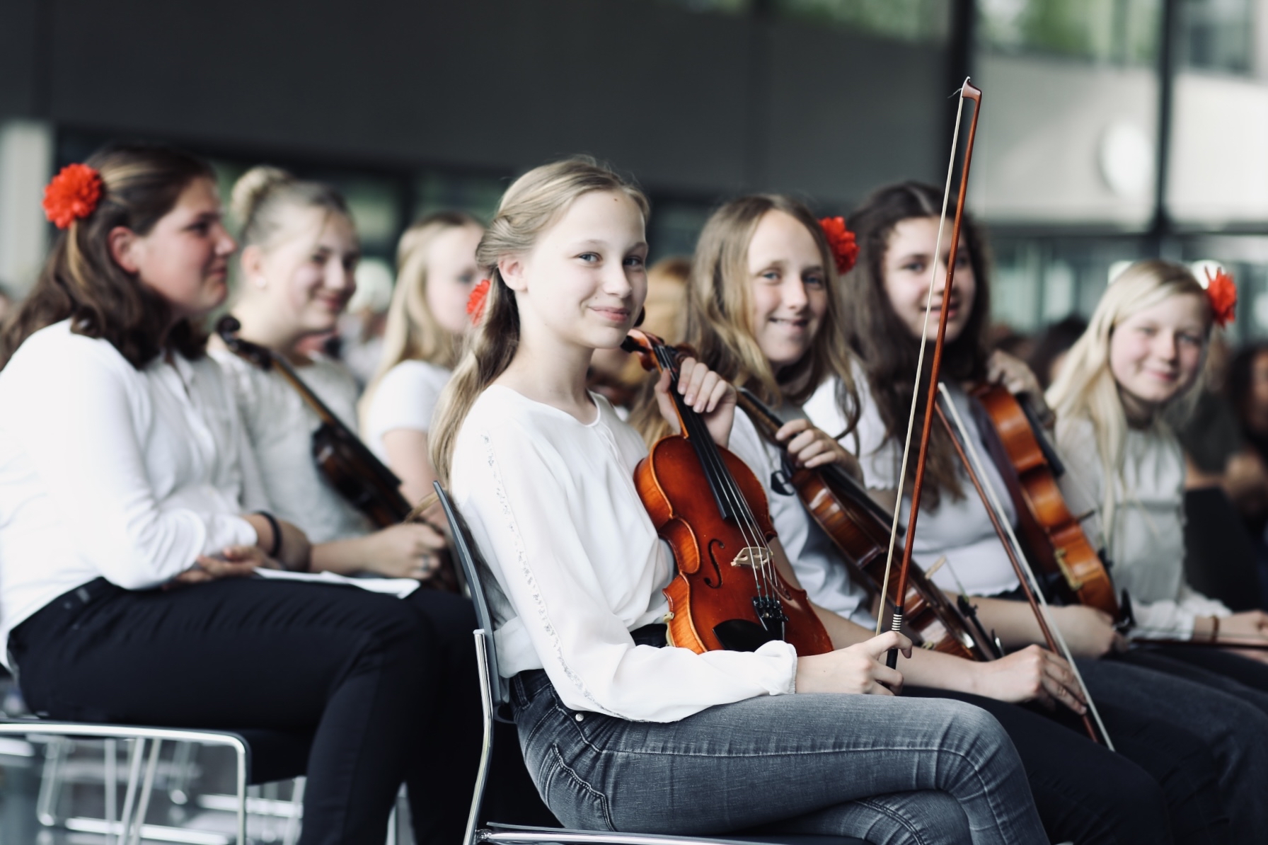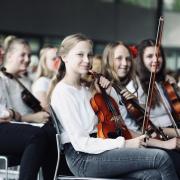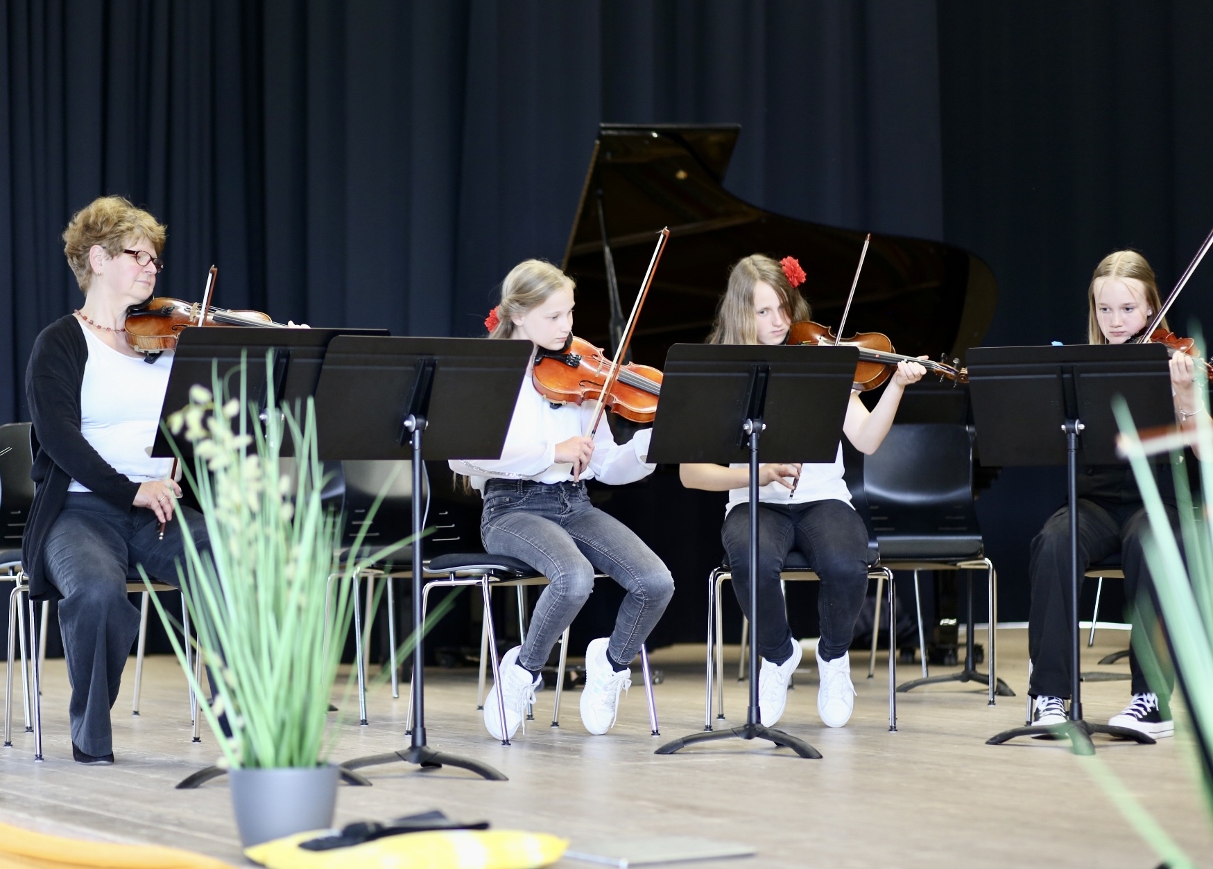 Die Streicherklassen 5 und 6 machten unter der Leitung von Susanne Albrecht-Krüger und unter Begleitung von Thomas Held am Klavier den Auftakt. Sie spielten Hoe Down von Stanley Fletscher und Barfuß im Regen, bevor sie mit zwei beschwingten Volksweisen und einem mitreißenden brasilianischen Samba den gemeinsamen Reigen beschlossen.