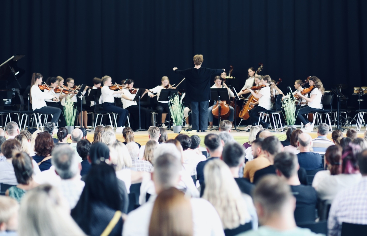 Frühsommerliche Temperaturen und erwartungsfreudige Zuhörerinnen und Zuhörer boten die geeignete Kulisse für das Konzert der Streicherklassen und des Streichorchesters der Heimschule St. Landolin.